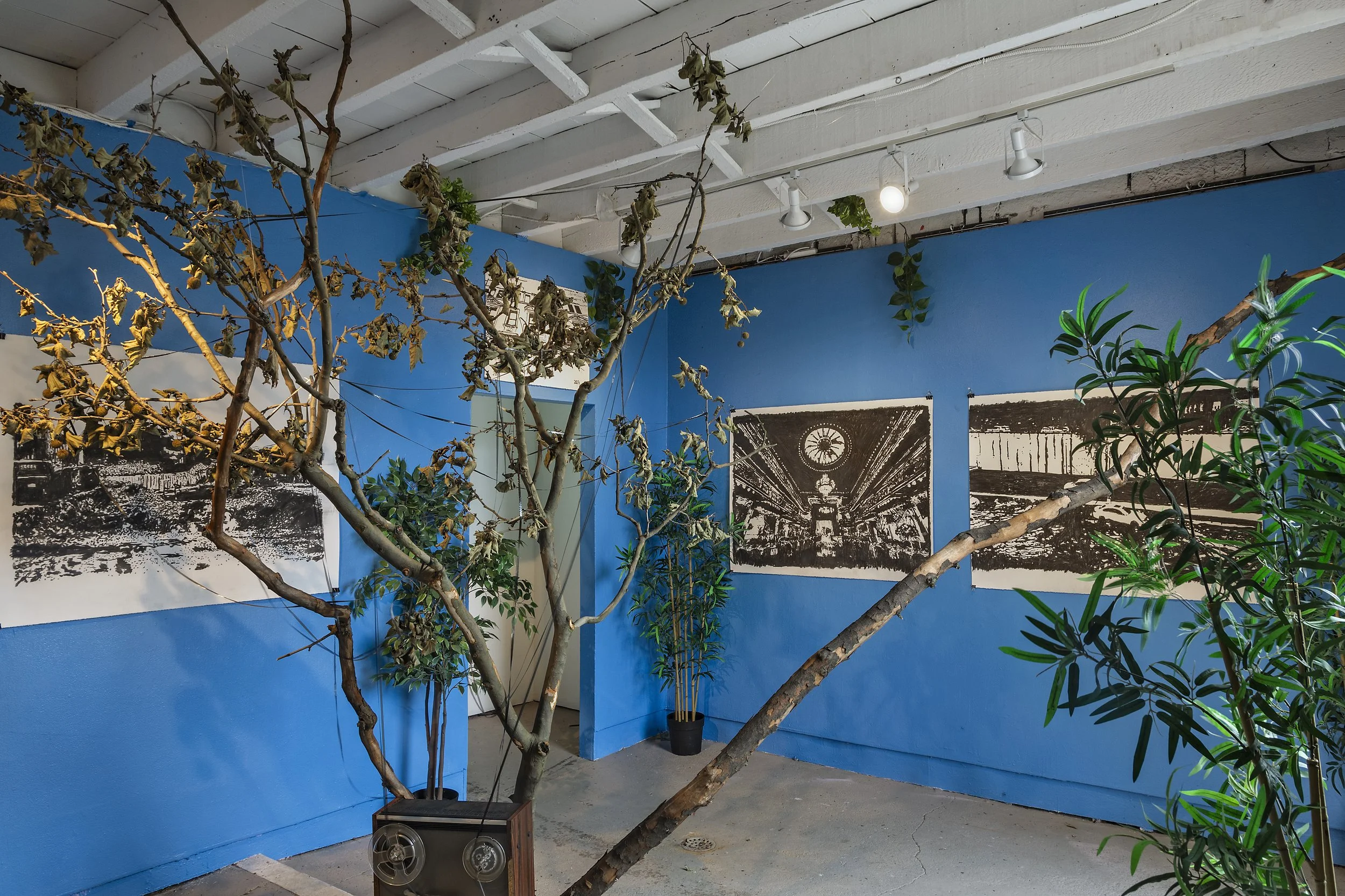 “Throughout the exhibition, I had the pleasure of meeting many locals who have lived in the area for generations and remember what is was like before there the Expressway divided the neighborhood. I heard stories about the Grand Prospect Hall, the weddings, birthday parties, proms, and Barmitzvahs that people attended when it was open. People shared with me their family photos of houses that were demolished, some of which I made drawings from, and videos of festive crowds dancing at the Hall that I played on a stack of old TVs alongside slowed down video surveillance-style footage of traffic on the expressway with the occasional flood of water. On walks along the highway, I collected sticks from under trees and created charcoal with them that I then used to draw with. I created drawings from my own photos of the expressway, overpass walkways, and the vines that intertwine with the fences that line the street. I also used archival material from the MTA of the construction of the expressway as inspiration for drawings as well as other older photos I found of the Grand Prospect Hall and its wild interior. Some of these photos were then used in a Green Screen photo booth where visitors could take their photo inside the Hall or on the expressway throughout time. On the outside of the gallery I wheatpasted images from this research, an open invitation to passersby to engage with their own stories.The show itself was a prompt for the neighborhood and it successfully brought many to gather and share their memories of this area at a time when things are changing and places are being erased. As the construction of a new condominium (overtop the recently demolished Grand Prospect Hall) loomed in the background of the gallery across the expressway, my installation proved to be a fitting space to mourn, dream, and remember together.” - sTo Len, Summer 2025