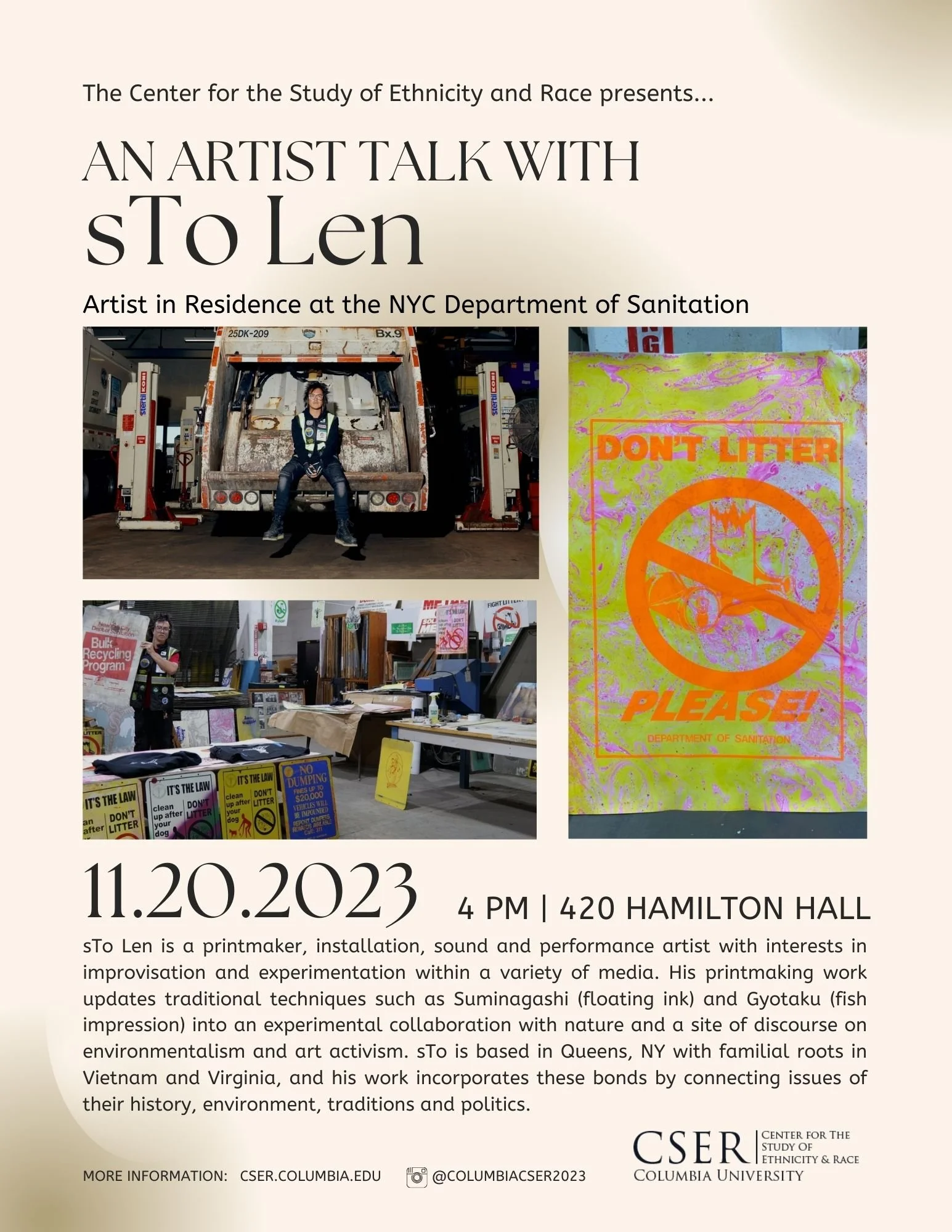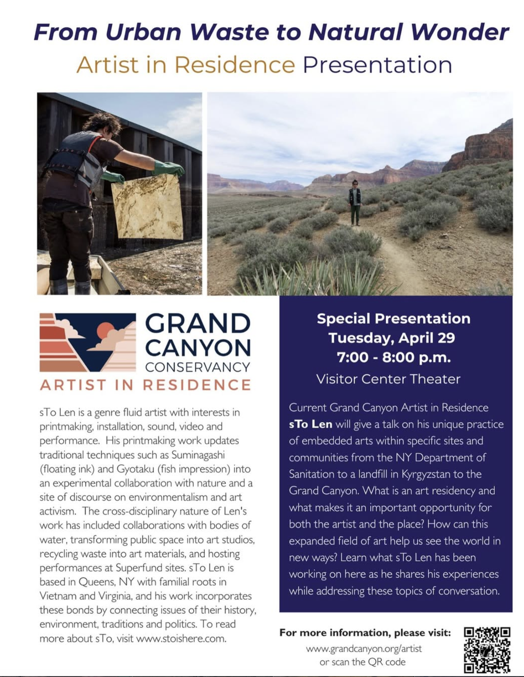 sTo Len is a renowned speaker who has presented talks on his art practice and its diverse intersections between ecological, personal, and social themes that span topics such as waste management, waterways, essential workers, identity, art history, printmaking, social practice, and community engagement. He has lectured at venues internationally including New York University, The New School, Parsons, the Museum of Moving Image, University of Minnesota, Rollins Museum of Art, Coastal Perspectives Lecture Series at the University of Connecticut, Grand Canyon Visitor Center Theater, Department of Social Science and Cultural Studies and Center for Critical Discard Research, Pratt Institute, Smith College, National Kyrgyz Fine Arts Museum, Cal State San Marcos, Columbia University, One Water Summit, Center for Book Arts, Rhode Island School of Design, Muscarelle Museum of Art, Bennington College, MIU Wege Center, Clark University, Composium at SUNY New Paltz, and the Brooklyn Public Library.